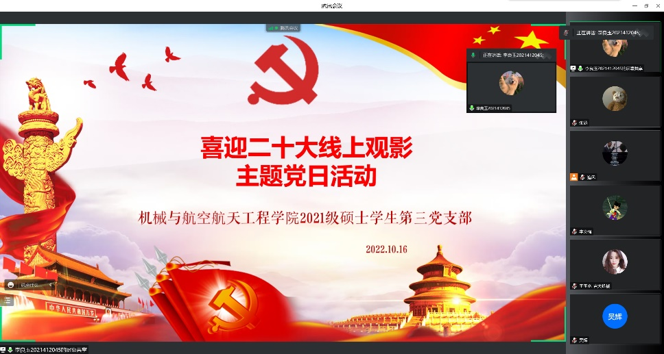 为迎接二十大胜利召开,学习二十大精神,机械与航空航天工程学院组织2021级硕士学生党支部于10月16日上午召开线上会议,共同观看党的二十大开幕实况,2021级硕士各党支部全体党员参与本次活动。
