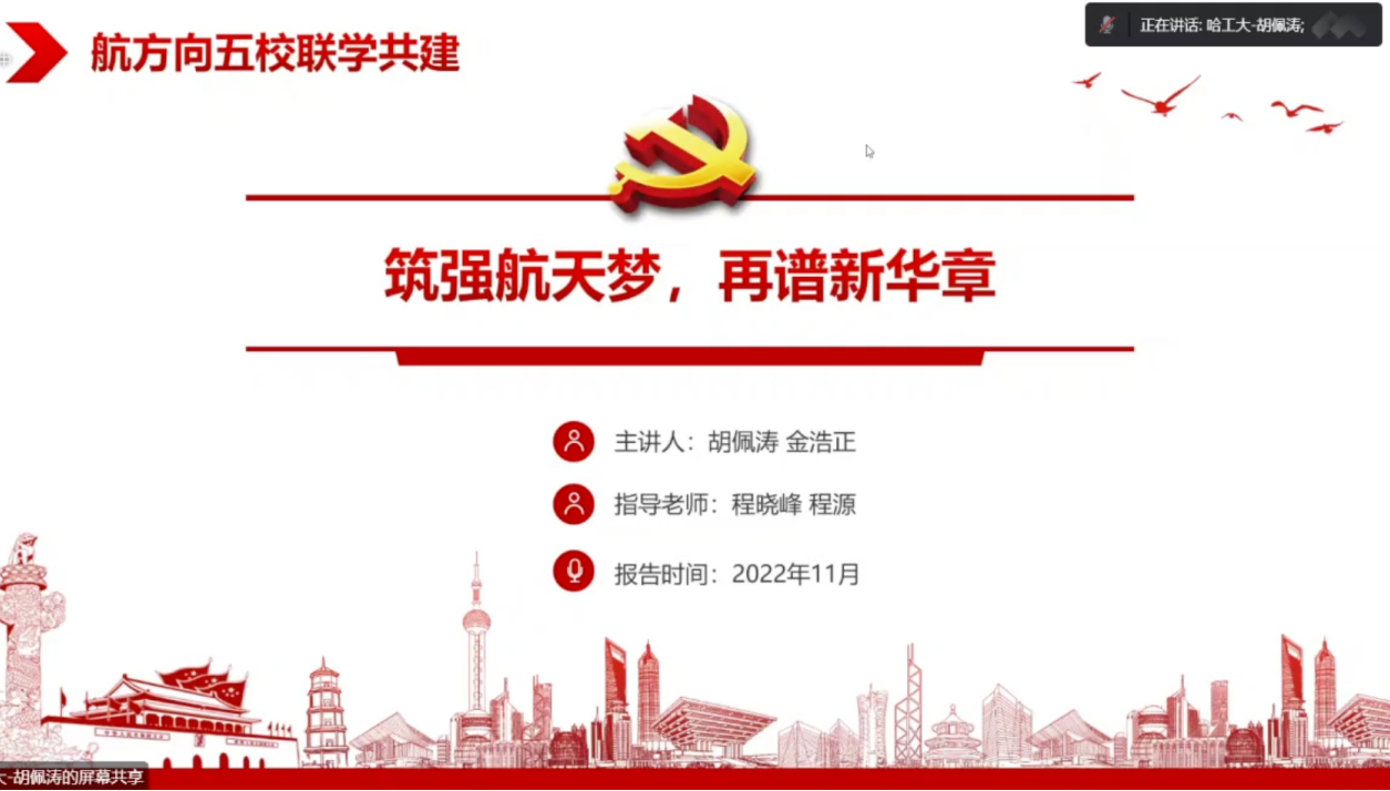 在分享解读二十大精神后,各学院学生党支部以航空航天人才和科研探索为主题进行报告。清华大学航天航空学院郭廷宇以《航天强国梦,矢志报国情》为题,指出中国航天制胜的法宝是:坚持党的集中统一领导,坚持社会主义集中力量办大事的新型举国体制。正是在党的领导下,全国上千家科研院所、大专院校等研制单位协同参与,大力发扬“两弹一星精神”和“载人航天精神”,在关键核心技术领域实现密集突破;北京航空航天大学宇航学院微小卫星实验室刘博涵给大家分享了“北航亚太一号”微小卫星的故事。亚太空间合作组织大学生小卫星项目是国家航天局在“一带一路”国际化空间战略的重点项目。在小卫星的设计过程中,小卫星党支部在疫情来临之时发挥党支部发挥战斗堡垒作用,在卫星研制各阶段党员冲锋在前,承担最繁重的任务,攻坚克难,保证卫星任务的顺利完成。