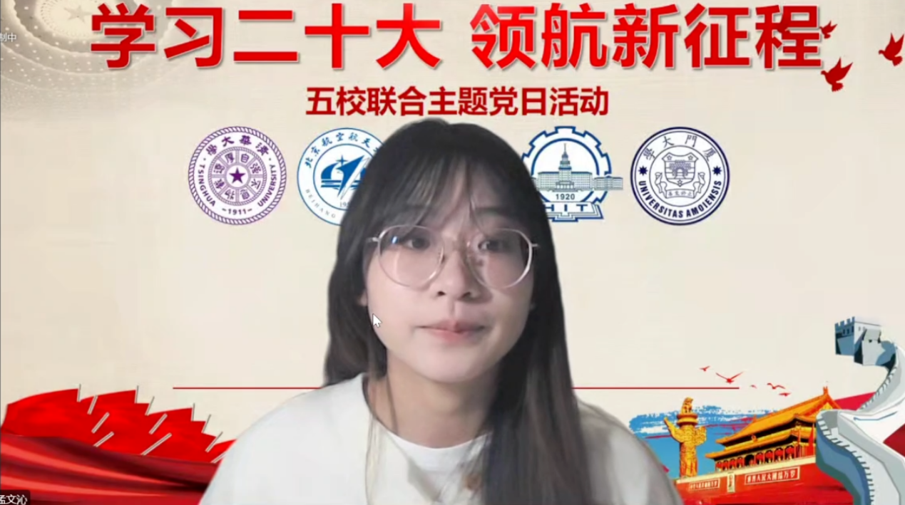 活动开始,全体成员集体观看习近平总书记在党的二十大报告中的重要讲话视频,对二十大精神进行学习。北京航空航天大学孟文沁以《奋进伟大征程,谱写时代华章》为主题从整体上对二十大的主要议程和内容主题进行介绍,指出二十大确定了新时代新征程中国共产党的使命任务,分析了国际国内形势,阐述了开辟马克思主义中国化时代化新境界、中国式现代化的中国特色和本质要求等重大问题。清华大学陈亮以《踔厉奋发新征程,逐梦蓝天向未来》为主题,从航空航天的角度出发,讲解过去五年党的工作和新时代十年的伟大变革。最后北京航空航天大学讲师夏侯超以《“两个确立”——新时代最重要的政治成果》为题对二十大精神进行解读学习部分进行收尾。