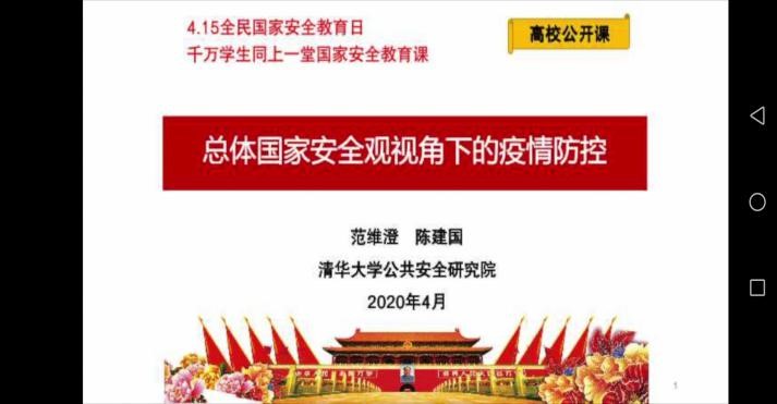 本次活动由省国安办、省教育厅、省团委共同举办,以“坚持总体国家安全观,统筹传统安全和非传统安全,为决胜全面建成小康社会提供坚强保障”为主题,旨在教育引导学生树立国家安全意识,提升维护国家安全的能力。本次课程由清华大学公共安全研究院的陈建国教授和范维澄教授共同授课。范教授从实例出发,阐释了国家安全风险及疫情对国际的影响。同时,范教授表达了对广大青年的殷切希望。