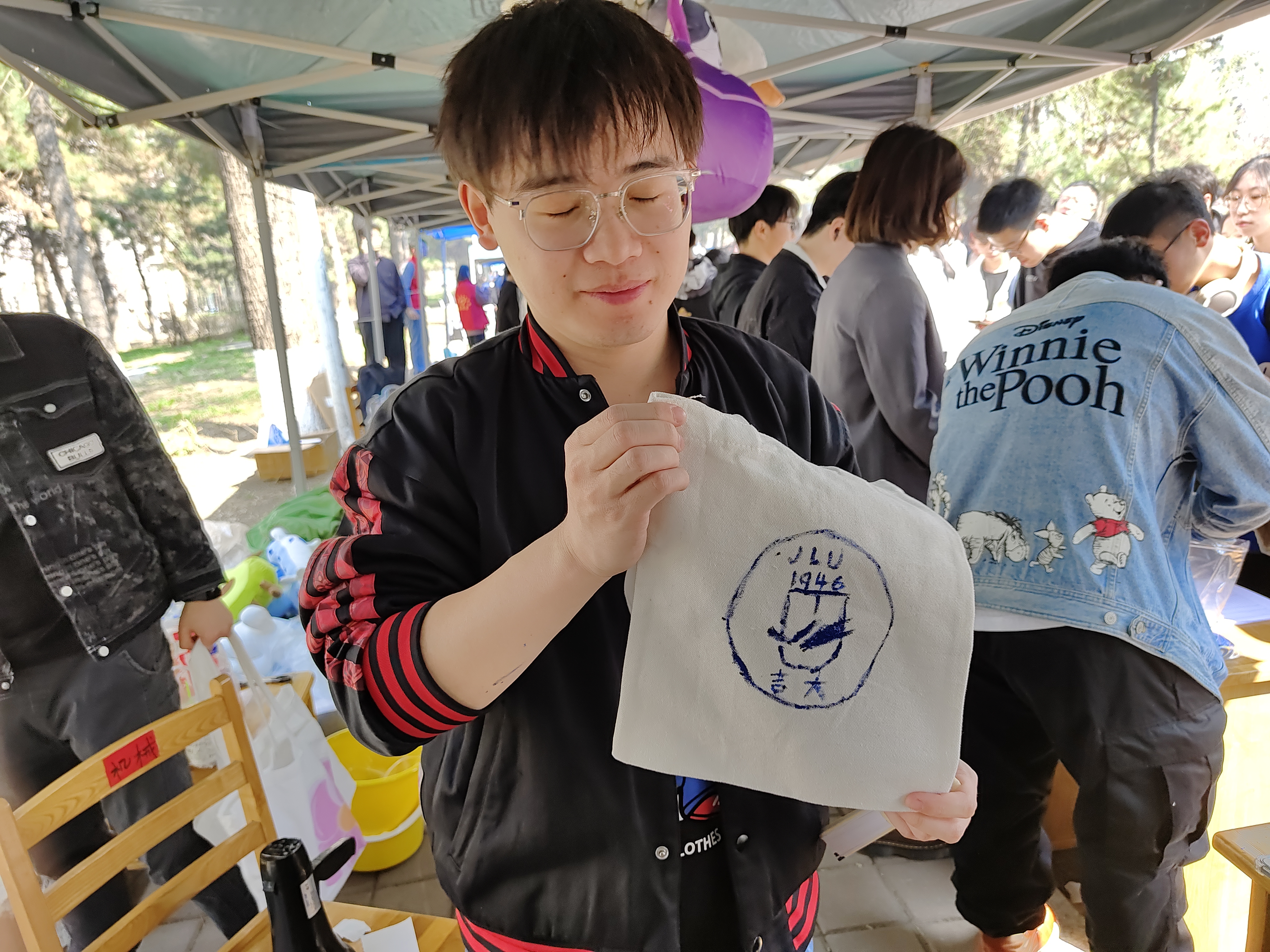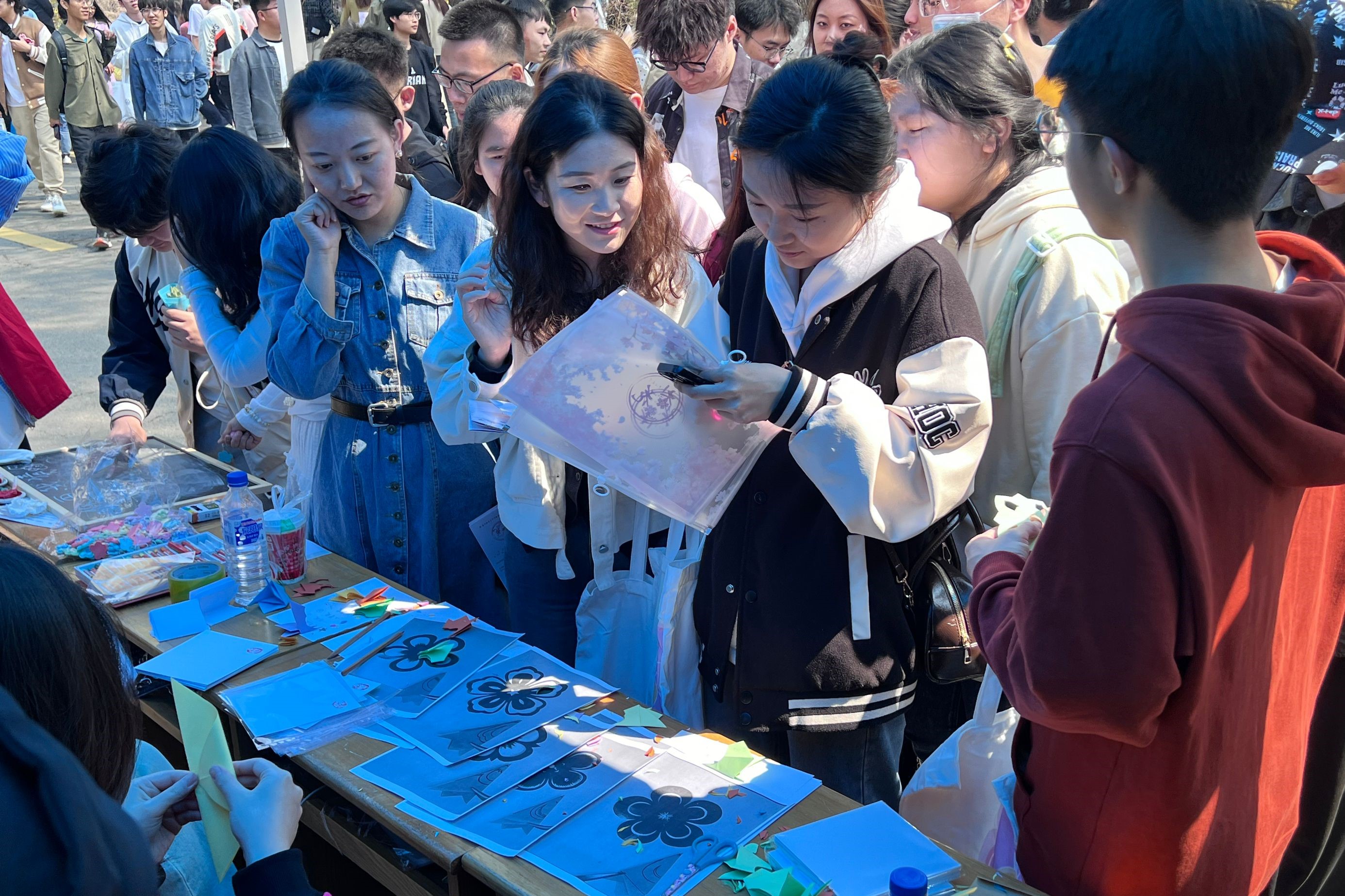 “花影占春·杏留万物”植物标本拓印活动中,师生朋友们在敲敲打打中把植物色彩“印”在布料上,把自然之美镌刻在春日时光里,活动现场吸引超300人次参与。