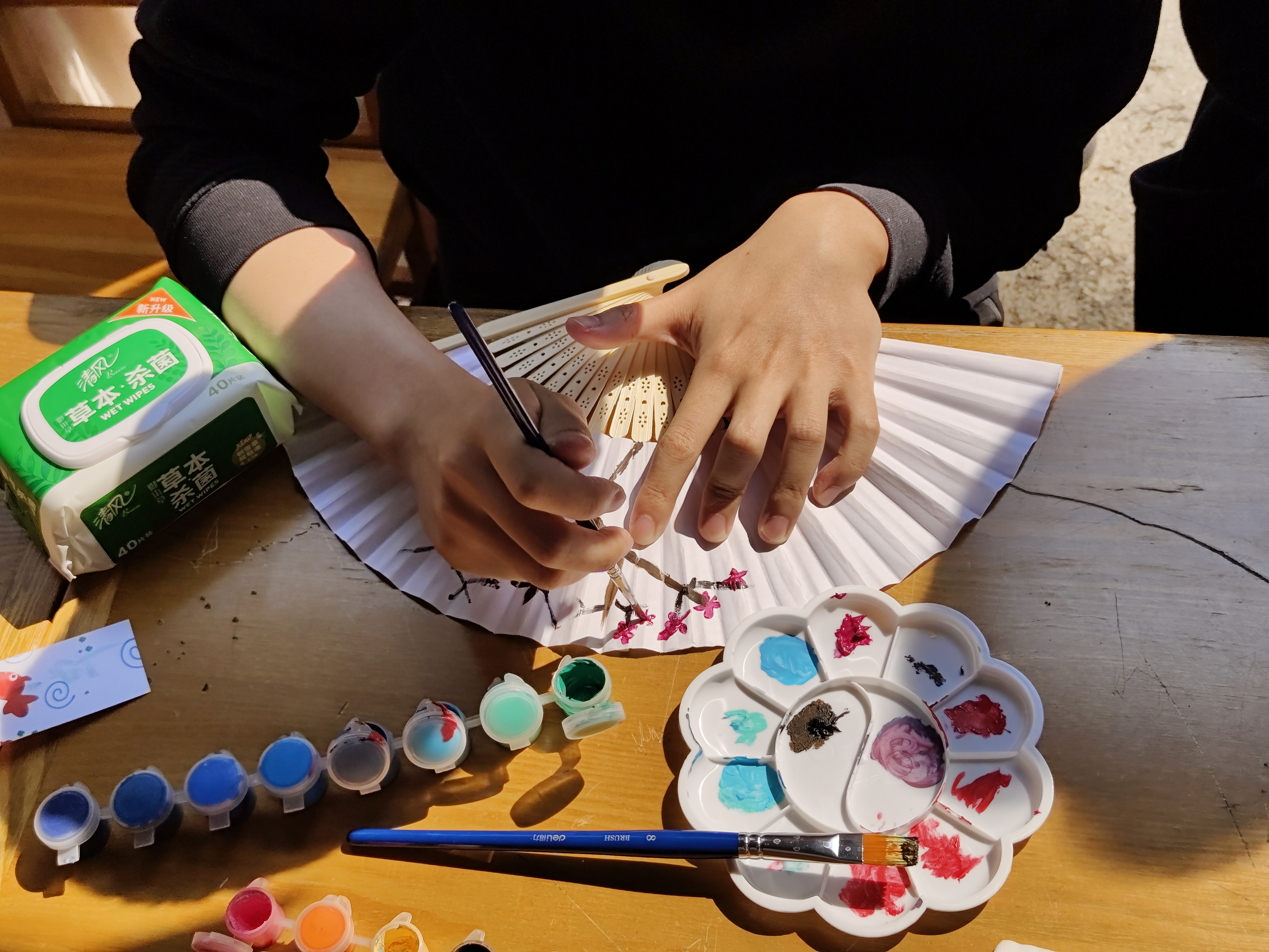 “杏纤纸扇·绘陶炫彩”陶扇面彩绘活动中,同学们手持画笔,在折扇和陶器素坯上勾勒描绘,留下青春的色彩。一件件别出心裁的作品中尽显青年学子的蓬勃朝气,一笔一划中满满都是托物兴怀的笔墨雅韵。